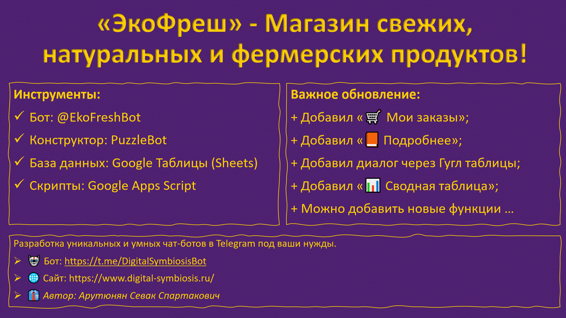 🎥 Смотрите видео на YouTube 🤖 Протестировать в боте Важное обновление: + Добавил «🛒 Мои заказы»; + Добавил «📙 Подробнее»; + Добавил диалог через Гугл таблицы; + Добавил «📊 Сводная таблица»; + Можно добавить новые функции … Инструменты: — Бот: @EkoFreshBot — Конструктор: PuzzleBot — База данных: Google Таблицы (Sheets) — Скрипты: Google Apps Script 🎥 Смотрите видео на YouTube 🤖 Протестировать в боте Разработка уникальных и умных таблиц (Excel и Гугл, VBA и Apps Script ), а также чат-ботов в Telegram под ваши нужды.