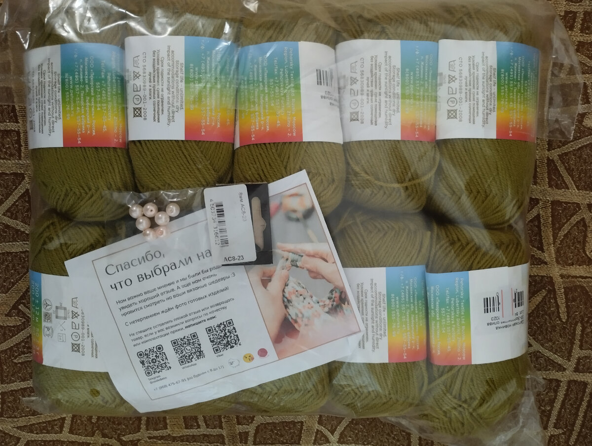 О "детском капризе" в сети пишут много и положительного и отрицательного. Я из этих ниток ни разу не вязала, хоть из акрила у меня много было изделий. Одно время, когда дети были маленькие, я только из акрила и вязала. Не помню, чтобы нитки сильно скатывались. Итак, получила целую упаковку 10 штук Цвет золотистая олива - 33. Я такой и хотела, осенний оттенок на французскую кофточку. Как говорят - вязаное полотно из этого акрила сильно катается. Ну посмотрим. Свяжу образец, постираю его в стиральной машинке и сделаю полный обзор. Кстати, Пехорка делает неплохие ниточки. Красивый оттенок, правда? Продавец еще и подарочек вложил. Очень приятно. Вряд ли я эти бусинки с этой пряжей буду сочетать. Пригодятся)