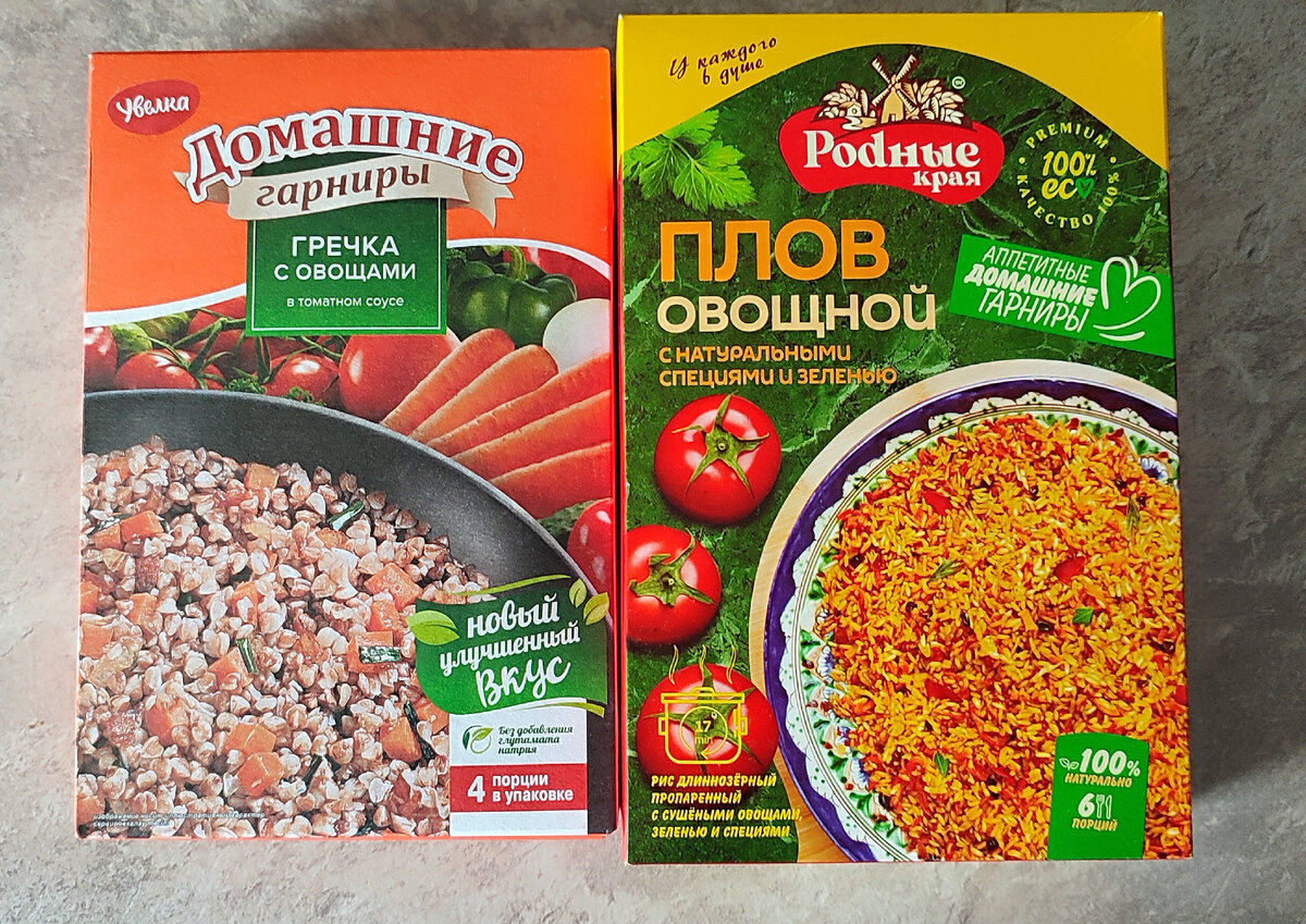 Всем привет! Недавно читал, что закрыли много Светофоров в Москве. К счастью повезло и у нас на районе он продолжает функционировать. И радовать интересными не дорогими товарами. Сегодня на обзоре гарниры быстрого приготовления. Гречневая каша с овощами в томате и овощной плов. Начнем с гречки. Гречка с овощами в томатном соусе известного бренда "Увелка". Цена 48,56р. Неплохая цена за 4 порции. Состав хороший. Внутри 2 пакета с гречкой. В пакетах видны специи, сушёный лук и морковь. Гречка визуально хорошего качества. Без шелухи, жуков и черных скорлупок, что часто присутствует в дешёвой гречке. Варим по рецепту на пачке. Через 20 минут готов гарнир. Одного пакет хватило даже на 3 порции. По вкусу гречка нормальная. Томатный соус не чувствуется совсем. Возможно из-за большого количества воды, указанного на упаковке в рецепте. На такой пакет воды нужно в 2 раза меньше. Учитывайте это при приготовлении. Также кому не нравится варёный лук, тут он присутствует в большом колич
