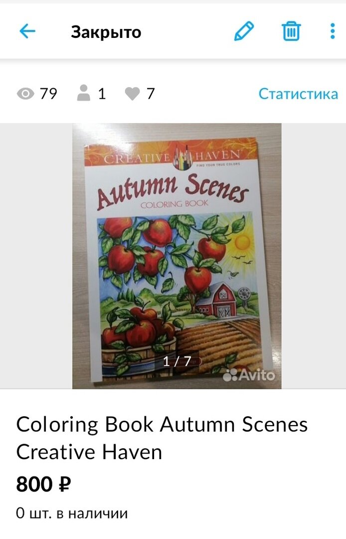 Всем привет! Давненько не писала, как у меня дела с Авито. Сегодня есть о чем рассказать, продажа хоть и небольшая, но есть. Сейчас у меня четыре заказа едут к покупателям, и скорее всего пойдут уже в август, так что эта продажа похоже последняя в этом месяце. Итак, что же я продала? А продала я раскраску. Раскраска абсолютно новая, иностранная, покупала ее на Вайлдберриз по хорошей цене с расчетом, что попробую продать, а если не продам, оставлю себе. Кто не знает, я обожаю раскрашивать в раскрасках антистресс, кому интересно, приглашаю на мой хобби канал https://dzen.ru/id/643314ad9e8c8d7bacf3732f. Так вот, о раскраске. Вот собственно и она. Я ее выставляла еще в апреле, но просмотров не было, раскраска то осенняя, поэтому я убрала ее до лучших времен, и выставила в середине июля, но по меньшей цене, чем изначально. И буквально через несколько дней у меня ее заказали. Раскраску уже забрали, и девушка даже оставила хороший отзыв. Плюс от продажи у меня небольшой, но я рада, что и свои