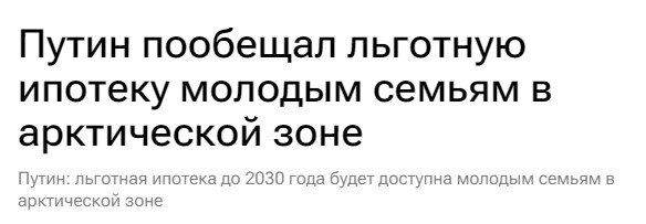 Об арктической ипотеке. Думаю, что такая мера может стать серьезной поддержкой для граждан, проживающих в арктической зоне... Согласен с тем, чтобы распространить ее на молодые семьи, проживающие на территории арктической зоны, то есть для них льготная ставка по ипотечному кредиту тоже не будет превышать 2%. Срок действия такой меры предлагаю установить до 2030 года, - сказал президент.