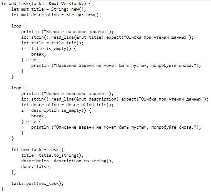 В этой статье мы улучшим наше приложение, добавив обработку ошибок при пользовательском вводе. В частности, мы будем проверять корректность введенных данных и выводить сообщения об ошибке в случае некорректного ввода. 1. Шаг 1: Обработка ошибок при добавлении задачи Для начала, модифицируем функцию add_task() так, чтобы она проверяла корректность пользовательского ввода и запрашивала повторный ввод в случае ошибки. rust 2. Шаг 2: Обработка ошибок при выборе действия Также обработаем ошибки при выборе действия в меню приложения, чтобы предотвратить некорректные вводы пользователей. rust 3. Шаг 3: Реализация функций для отметки задачи как выполненной и удаления задачи Добавим функции mark_task_done() и remove_task() для отметки задачи как выполненной и удаления задачи соответственно. rust 4. Шаг 4: Запуск программы Сохраним файл и запустим наше улучшенное приложение: bush"cargo run" Теперь наше приложение обрабатывает ошибки при пользовательском вводе и предоставляет более интуитивный ин