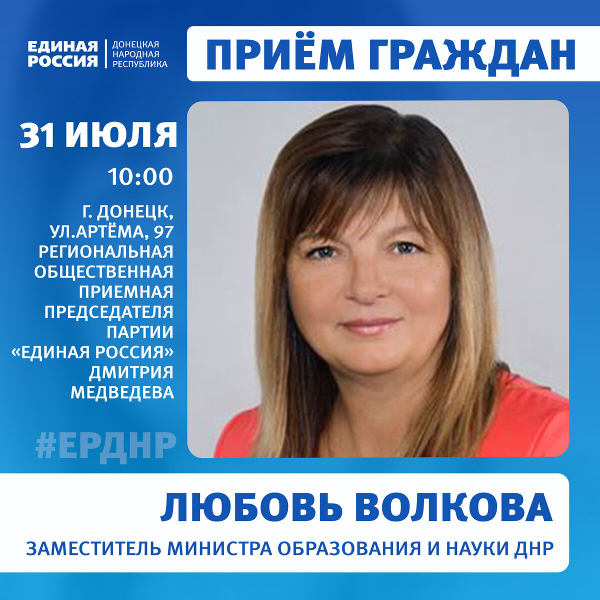 Неделя приемов граждан по вопросам образования пройдет с 31 июля по 4 августа 2023 года в региональной и местных общественных приемных Председателя партии «Единая Россия» Дмитрия Медведева. Следите за нашими анонсами и приходите на приемы. #ЕРДНР #ЕРпомогает #ЕдинаяРоссия #ПриемЕР
