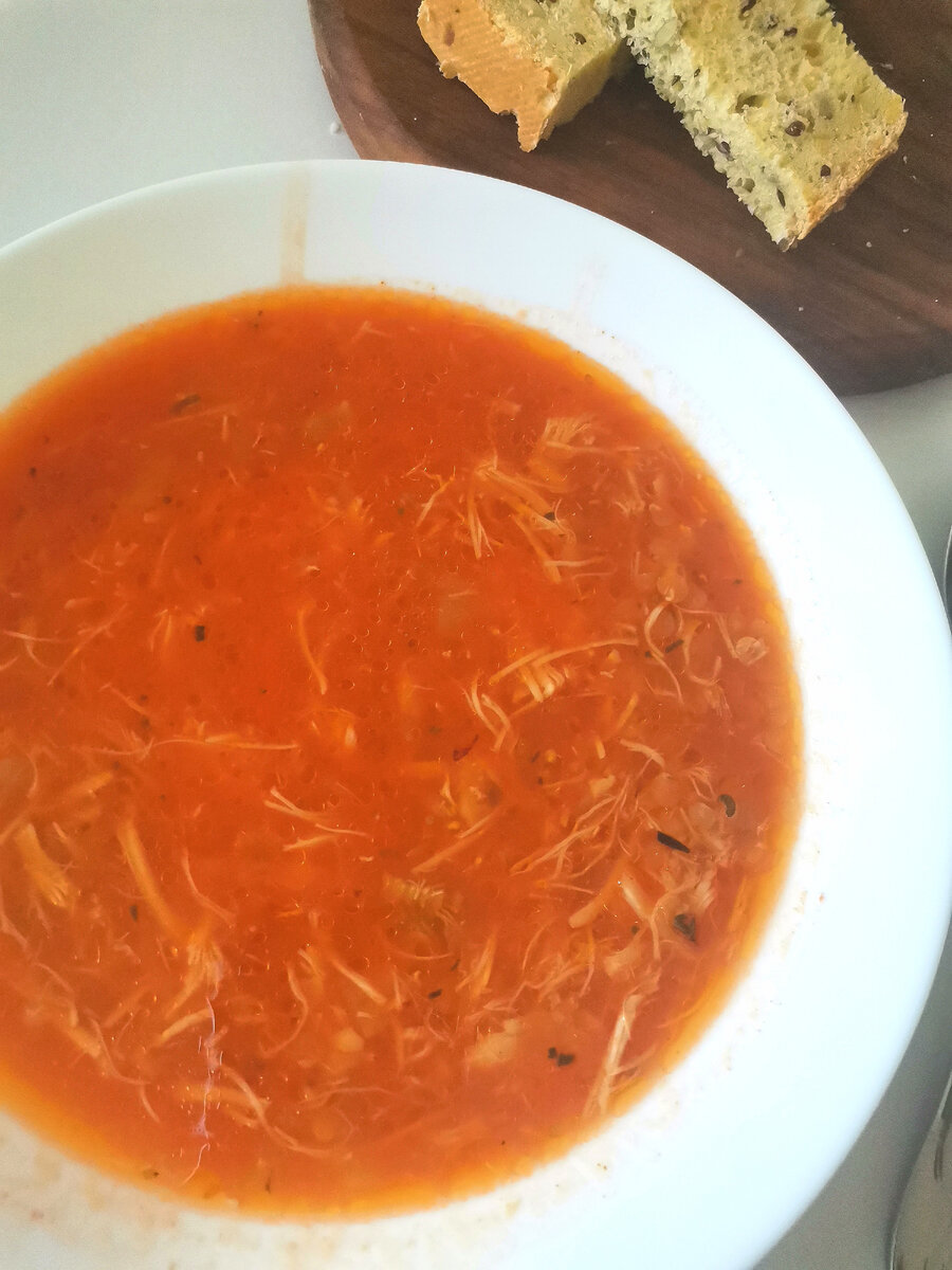 Ели подобный супчик в Турции, почему бы и дома не приготовить. Хорошо то, что активной готовки 5 минут. А ещё можно добавлять любимые специи и даже вермишель для более сытной консистенции. Основа куриный бульон. Предварительно нужно отварить курицу или её кусочки, бульон процедить, куриное мясо нарезать или нарвать по волокнам и отправить обратно в бульон. В сковородку складываем нарезанный лук репчатый, натертую морковь и мелко нарезанный сельдерей, всё обжариваем на растительном масле до мягкости. После этого в сковороду добавляем томатную пасту Всё перемешиваем, минутку подождем и перекладываем в кастрюлю с бульоном и мясом. Даём пару минут покипеть, добавляем любимые специи - я добавляю паприку и сумак и готово. Подаём с сухарикаиии долькой лимона. Приятного аппетита!