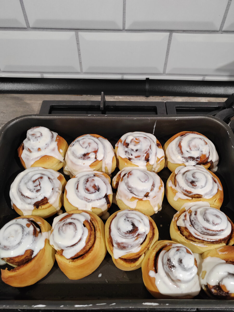 - Разрезаем рулет на булочки. Чем шире отрезаная часть рулета, тем больше будет булочка.