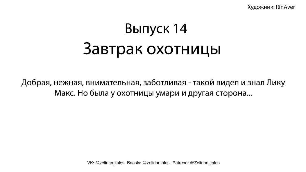 Всем привет! Сегодня у нас безобидная (на самом деле нет) история о том, на кого иногда приходилось охотиться Лике. А что делать,есть-то хочется! Особо впечатлительным читать одним глазком ;) Анценз как всегда на нашем Бусти: https://boosty.to/zeliriantales