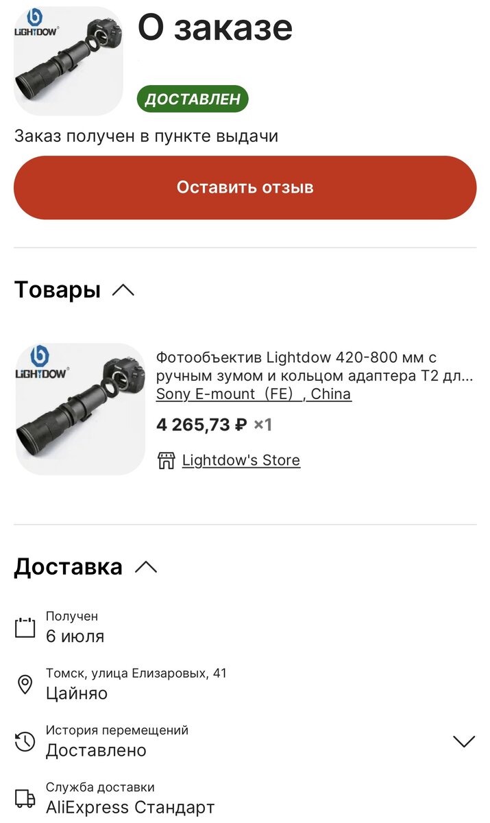 Входной порог в фотоохоту достаточно высок, длиннофокусные объективы со стабилизацией и автофокусом стоят от 80000₽ и в бесконечность, а это никак не входило в мои планы. Всё-таки смотреть красивые фото это одно, а делать их самому — другое. Вдруг получится так, что куплю дорогущий объектив, а пофотографирую и пойму, что это не моё. Да, хорошая оптика, если её не разбить и не ушатать, со временем не сильно подешевеет, особенно такая узкоспециализированная, но всё же. Цена вопроса здесь это ключевой момент. Отдавать 147000₽ за объектив Sony 200-600 mm для моей Sony не хотелось. И ВОТ ТАК Я СНОВА ПРИШЁЛ НА АЛИЭКСПРЕСС.