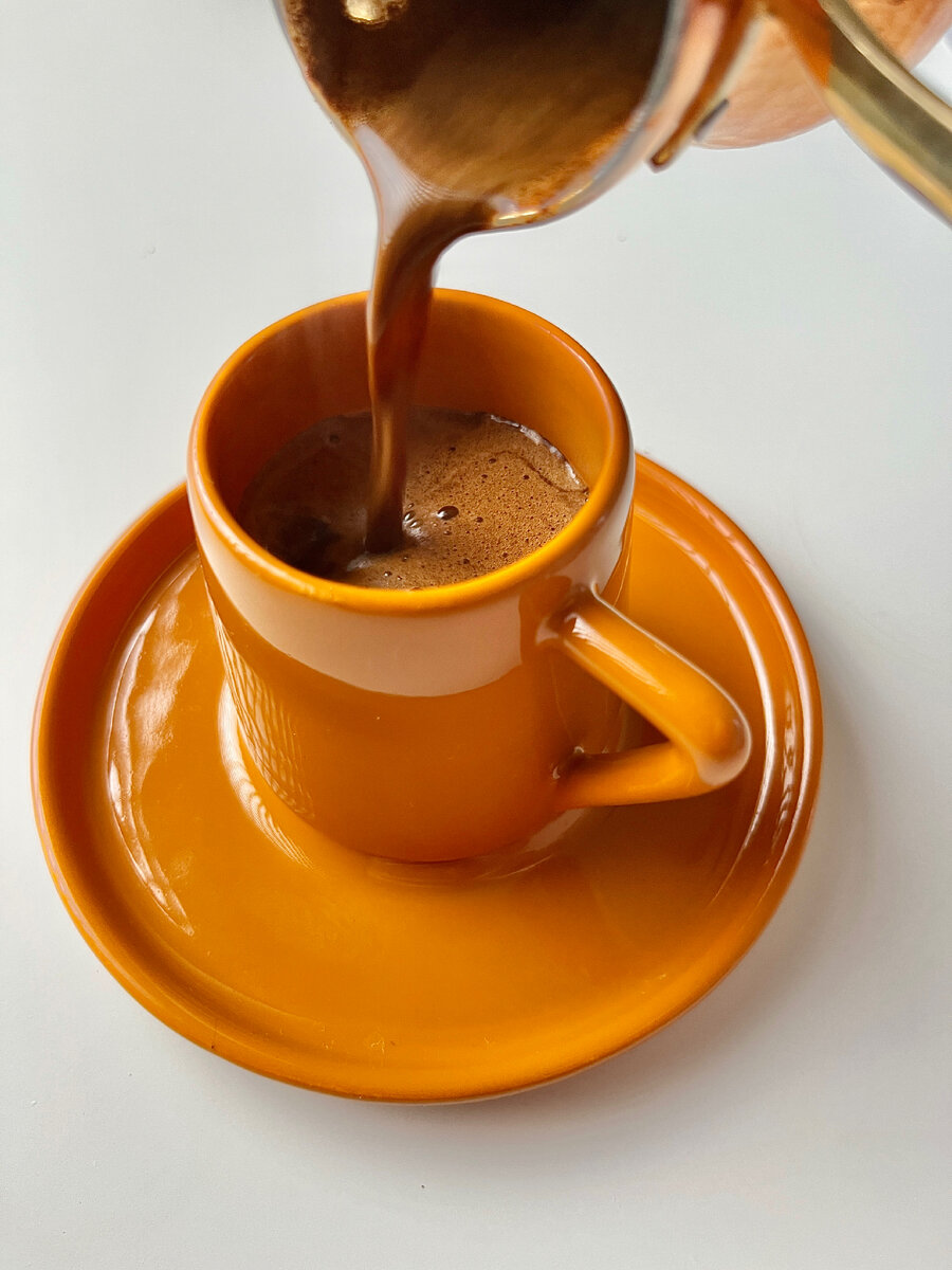 Когда ваша шапка слегка поднялась, то аккуратно перелейте ваш кофе в профессиональную кофейную чашку. На моем фото Джезвы вы видите поднятие шапки до самых краев из за ее конструктивных особенностей. Этот шаг не является фиксированным и например в Афине я поднимаю шапку на 60% от ее свободного горлышка. Избыточное поднятие шапки заставит ваш кофе гореть, а если этот этап недостаточен, то ваш кофе может быть слегка недоэкстрагирован. Вам нужно проводить побольше времени с вашей Джезвой и тогда вы легко будете чувствовать особенности каждой из них на этом этапе.