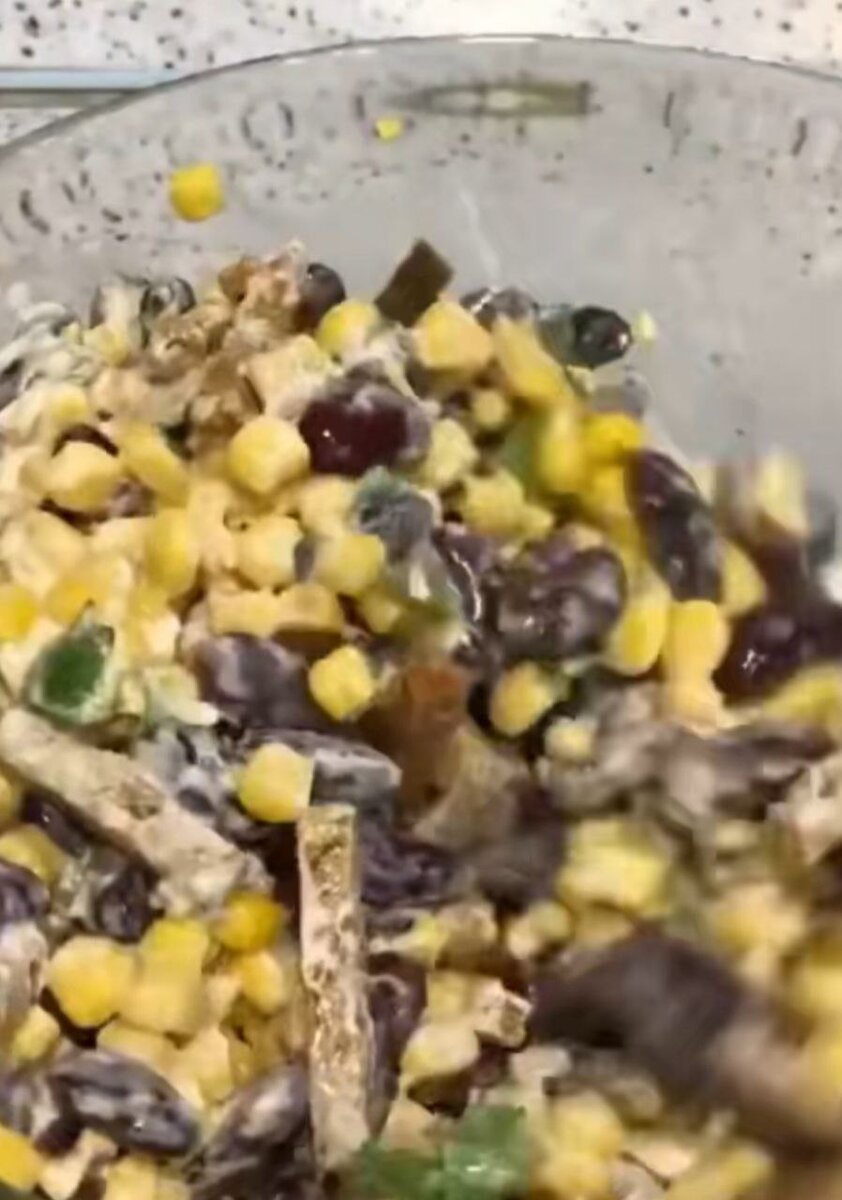 Понадобится: Кукуруза консервированная Фасоль красная консервированная Чеснок Петрушка Майонез или сметана Сухарики Готовим: Открываем банки, высыпаем в чашку. Нарезаем петрушку добавляем к кукурузе с фасолью, сюда же выдавливаем чеснок. Заправляем майонезом или сметаной. Украшаем сухариками. Приятного аппетита!