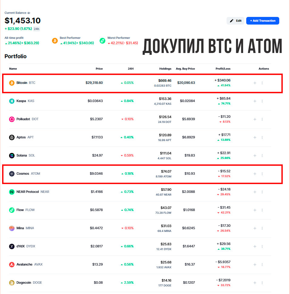 ✅ 0.000340 монеты BTC (10$). Цена Биткоина сейчас 29300. В долгосрок довольно хорошая цена. Я считаю, до 35к покупать резонно. Сейчас биткоина на 46% в портфеле. Буду доводить до 50%. Средняя цена покупки - 20090$. Я покупал биткоин и по 17к $ и по 25к $. По итогу средняя цена неплохая. Подготовился к бычке. Позиция размером - 669$.