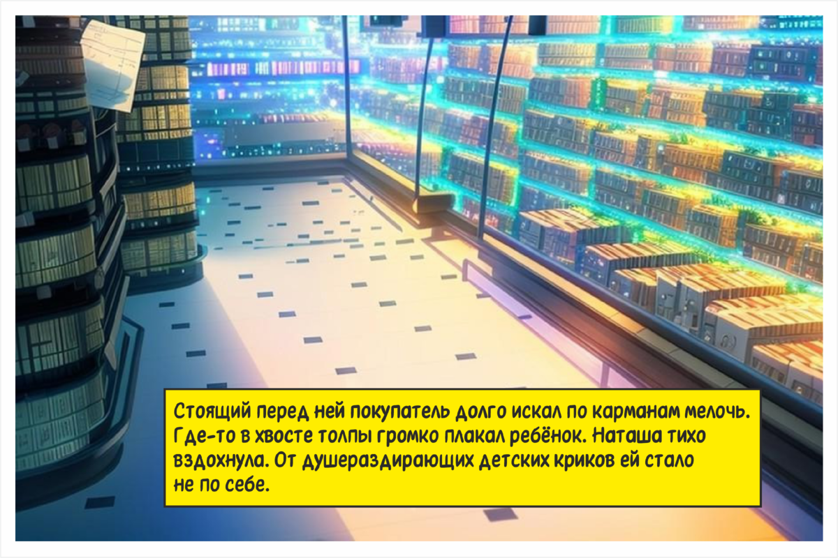 Натянув футболку и слегка мятые шорты, женщина направилась в магазин. На кассе собралась очередь. Наташа с раздражением выложила продукты на ленту. Стоящий перед ней покупатель долго искал по карманам мелочь. Где-то в хвосте толпы громко плакал ребёнок. Мать что-то говорила ему, но малыш не успокаивался. Наташа тихо вздохнула. От душераздирающих детских криков ей стало не по себе.