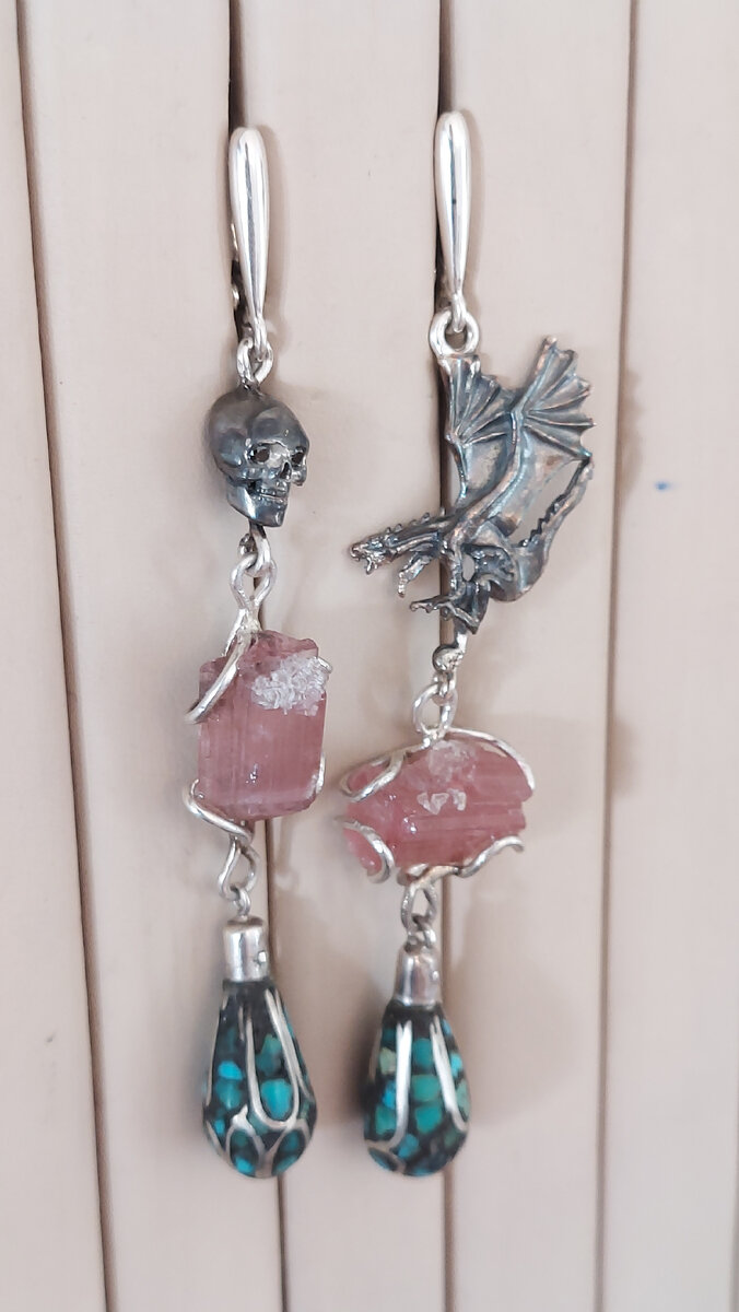 И снова здравствуйте! 🌞 Как и обычно по выходным, мы продолжаем трудиться на наше с вами общее удовольствие🍀 Сегодня выдали вот такой заказ. Серебряные асимметричные серьги. За основу взяли винтажные капельки бирюзы и необработанные кристаллы розового турмалина - рубеллита с малханского месторождения. Которое находится у нас в Забайкалье. Как хорошо видно на фото, кристаллы рубеллита присыпаны маленькими белыми кристалликами кварца. Что по нашему замыслу символизирует заснеженные горные вершины в лучах восходящего солнца. Глазные впадины черепа инкрустированы натуральными черными бриллиантами. Череп и дракон покрыты чёрной патиной. Остальные серебряные элементы мы оставили отполированными. Серьги яркие и эффектные. И безумно идут их владелице. Так приятно видеть радость в ваших глазах, когда вы забираете свои заказы! Следом размещу видео с подробным рассказом об этом украшении.