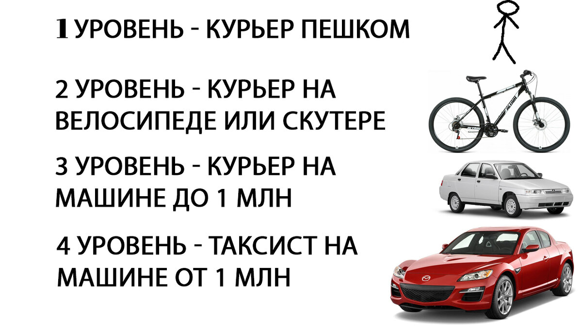 Я познакомился с мужчиной, который начинал на велосипеде, уже купил скутер и сейчас копил на машину, чтобы работать уже на ней. По его мнению: