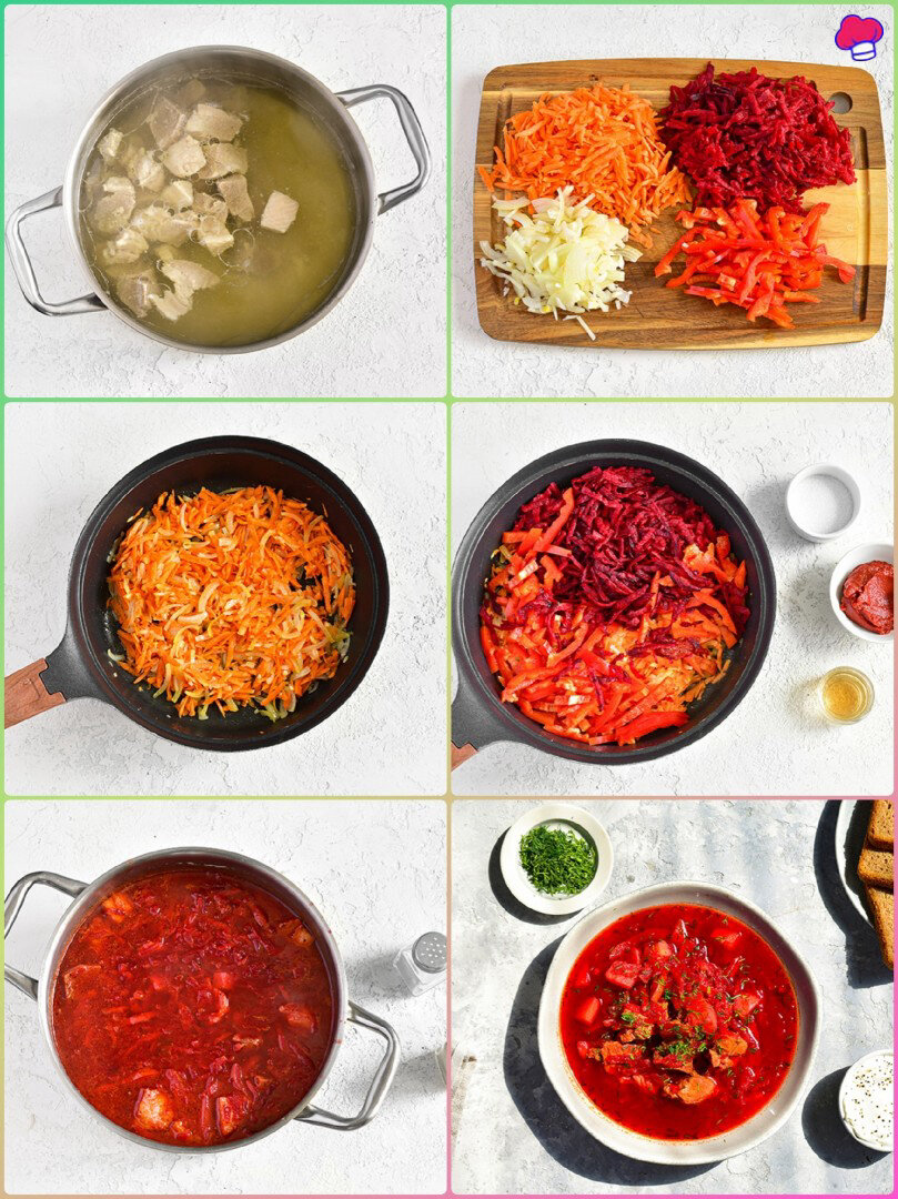 Свекольник с мясом Свекольник хорош тем, что его можно подавать как в горячем виде, так и в холодном. Отличная идея для лета, которое иногда дарит нам совершенно непредсказуемые погодные сюрпризы! То есть, если за окном прохладно и дождливо, подаем свекольник с мясом на стол горячим. Если же стало жарко, едим этот суп холодным. В нашем рецепте мы предлагаем варить свекольник со свининой, исходя из того, что это мясо готовится быстрее, чем говядина. Да и в принципе крепкий бульон летом ни к чему. Можно поступить и по-другому: сварить мясо отдельно, сам свекольник приготовить на воде и перед подачей на стол добавить в него кусочки свинины. 📌Ингредиенты: ● мякоть свинины – 400 г ● питьевая вода – 2,5 л ● морковь – 100 г ● свекла – 300 г ● репчатый лук – 150 г ● сладкий перец – 150 г ● растительное масло – 2 ст. л. ● томат-паста – 2 ст. л. ● яблочный уксус – 1 ст. л. ● сахар – 1 ч. л. ● картофель – 300 г ● соль ● свежемолотый черный перец – по вкусу 🔑Приготовление: 1. Приготовьте бульон