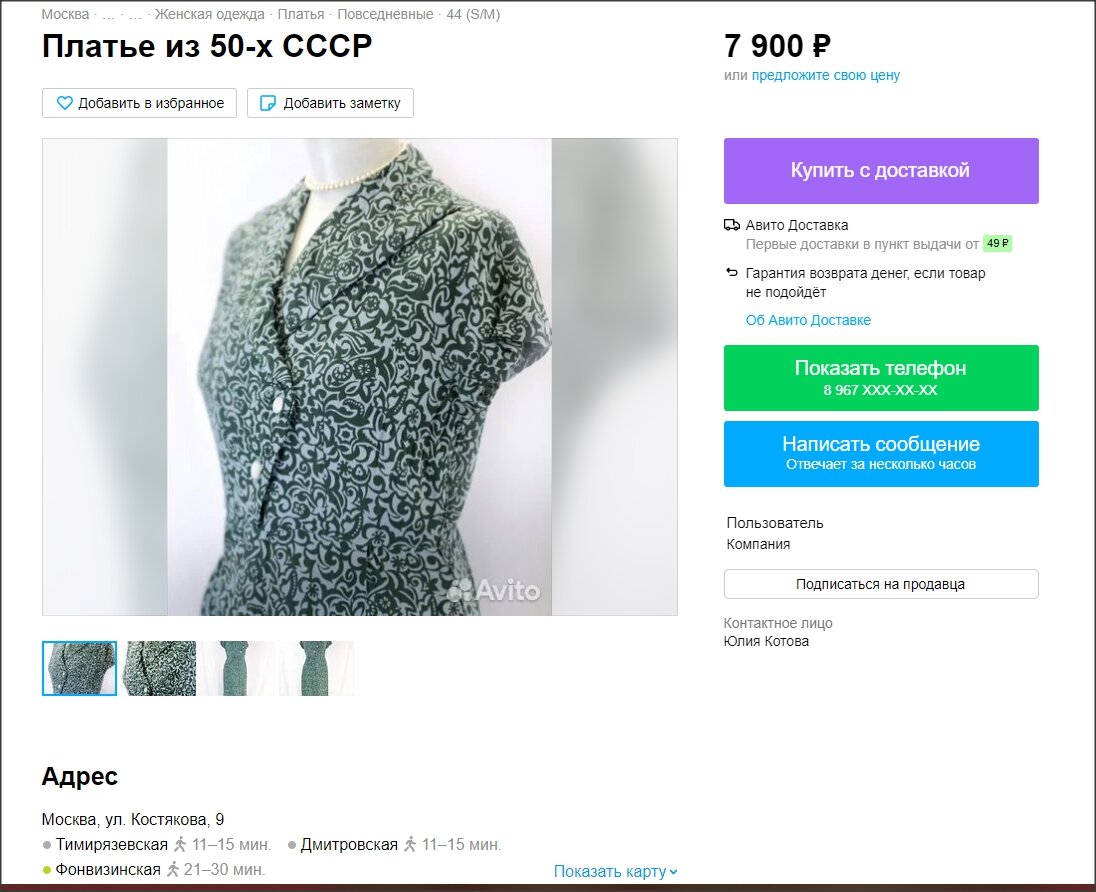 Сразу скажу, что эти кадры я сделала давно. Сейчас на авито может не быть этих конкретных материалов, но есть другие. "Авито" - полезная площадка для просмотра винтажных платьев и тканей, иногда. Вот такое нашлось "Платье из 50-х СССР". Продаётся дорого. Похоже на платье-халат. Состав и вид ткани не могу понять. В 1950х - начале 60х годов платья-халаты были такого шикарного кроя, с широкими воротниками и запахом. Но и выходным вполне может быть. Воротник ассиметричный - это красиво. И сшито очень изящно, без внешних видимых швов, как мне нравится. В современной лексике, это платье-футляр. А вот эти выкройки совсем недорогие. Мне не нужно - у меня нет таких готовых выкроек, но много других старых журналов и чертежей, да и шью обычно по своим выкройкам, по индивидуальным меркам. "Государственный универсальный магазин." ГУМовские выкройки в натуральную величину в бумажных конвертах, - пожалуй, раритет, оказывается, были и такие. "Готовые выкройки винтажной одежды." Если В