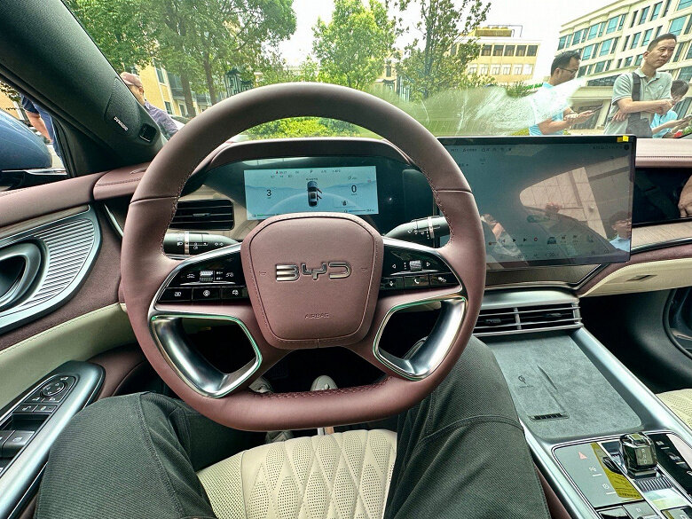 В отличие от спортивного интерьера BYD Seal EV, седан PHEV выглядит более практичным и удобным. У него приятные на вид деревянные элементы на центральной консоли и дверных картах. Центральный туннель Seal DM-i имеет просторный отсек. То же самое и с подлокотником. Автомобиль получил платформу Qualcomm 7325 и операционную систему DiLink 5.0. Он получил огромный 15,6-дюймовый поворотный экран и проекционный дисплей. Диагональ панели приборов — 10,25 дюйма. Звуковая система Seal DM-i изготовлена компанией Dynaudio.