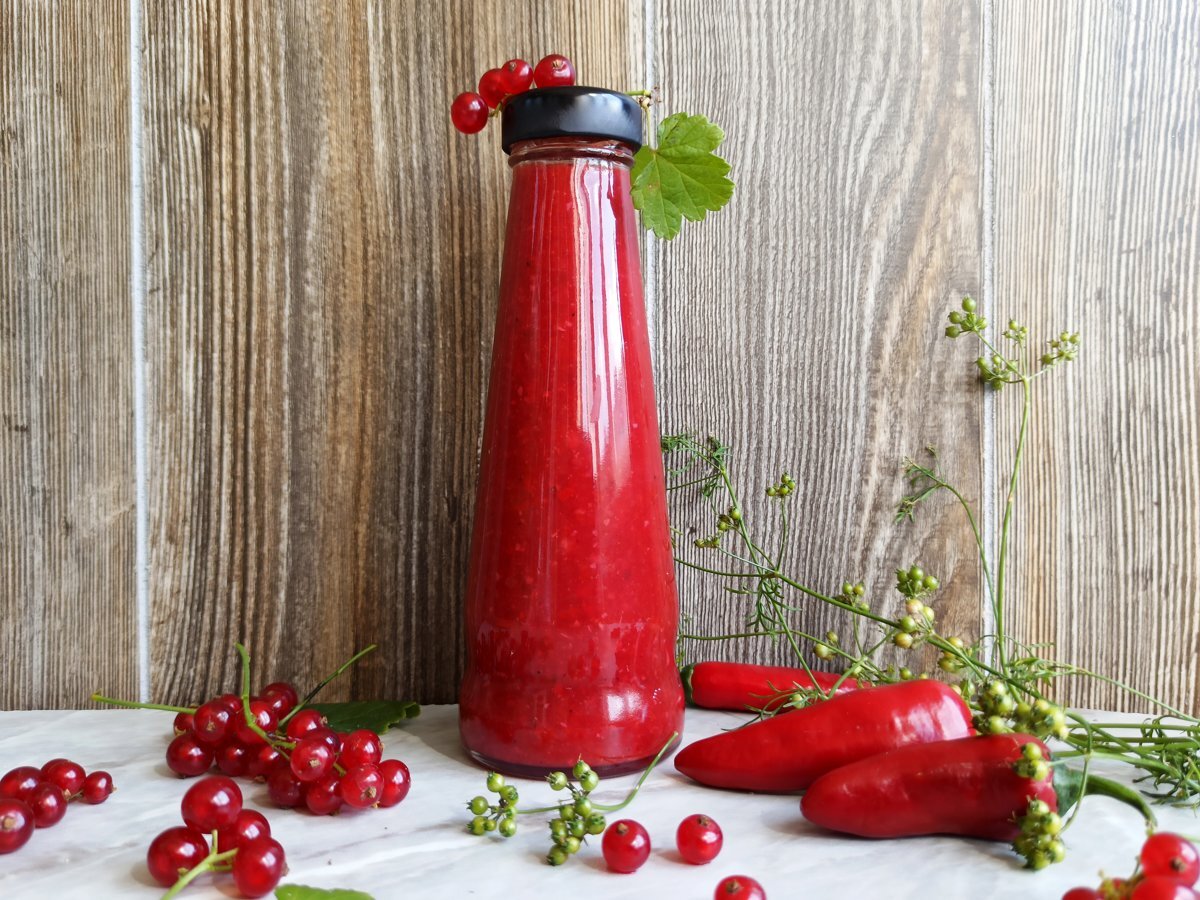 Очень вкусный и ароматный соус из красной смородины для шашлыков, стейков, запеченной птицы или дичи. Ингредиенты Приготовление: 1. Подготовить ингредиенты для соуса из красной смородины. Овощи и ягоду помыть и просушить. 2. Ягоды сложить в кастрюлю. Веточки можно не обрывать. Влить в кастрюлю 3-4 ст. л. воды, включить средний огонь и закрыть кастрюлю крышкой. Пропарить ягоды 5 минут. 3. Ягоды осядут, станут мягкими. Размять их толкушкой. Дать остыть. 4. Яблоки почистить от шкурки. Сладкий перец нарезать кусочками, удалить семена. Чеснок очистить от шелухи и нарезать. 5. Измельчить яблоки, чеснок, сладкий и острый перцы в пюре. Острый перец кладите по вкусу. 6. Остывшую красную смородину протереть через сито или дуршлаг с мелкими дырками. Получится почти один сок с небольшим количеством мякоти. 7. В кастрюлю выложить овощное пюре. 8. Добавить соль, сахар, специи. 9. Поставить на огонь и варить 20 минут, периодически помешивая. 10. Горячий соус разложить по сухим стерилизованным бутылка