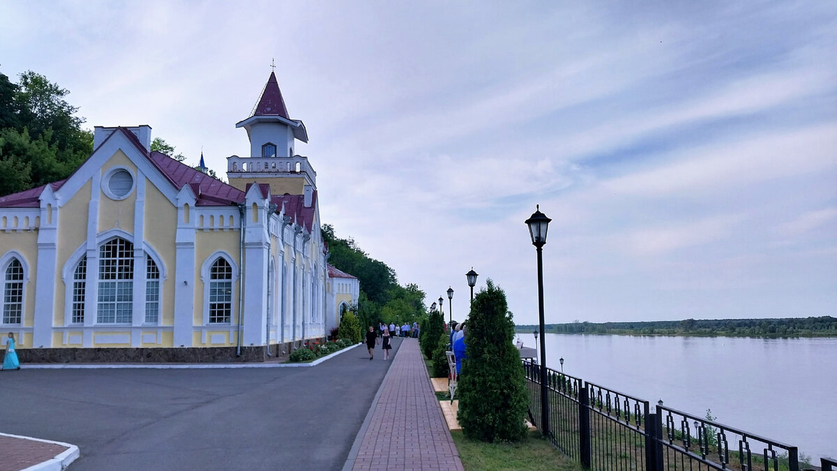 На высоком берегу Камы стоит красивая здание с башней. Светлое, нарядное, воздушное:
