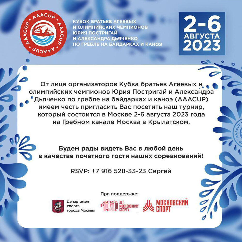 Со 2 по 6 августа на гребном канале в Крылатском пройдет ежегодный Кубок братьев Агеевых и олимпийских чемпионов Юрия Постригай и Александра Дьяченко по гребле на байдарках и каноэ. Приходите поболеть за команды и просто хорошо провести время.