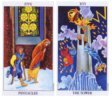 Мы видим двоих, они попали в материальный кризис, плохо им, голодно-холодно и плетутся они мимо Храма и прямиком в Башню, где именно они, опять двое, слетят с самого верха.