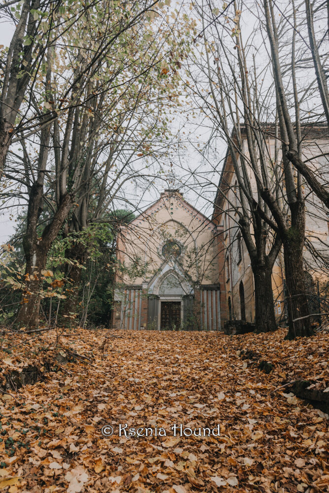 Проскользнув под покосившиеся ворота, мы оказались на поднимающейся в гору старой дороге, усыпанной золотом опавших листьев. На вершине виднелась треугольная крыша церкви.