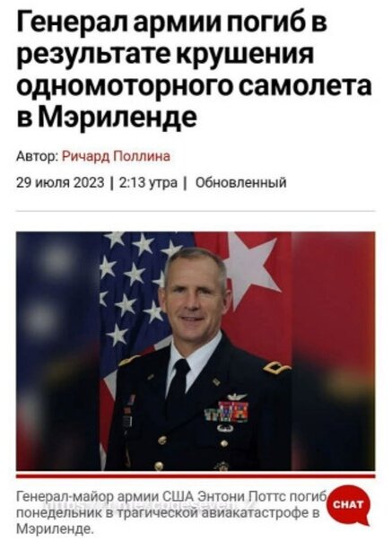 Вот этот американский генерал, по версии американских СМИ, погиб в авиакатастрофе. Впрочем, по интернетам ходят слухи, что погиб он совсем не в США а значительно восточнее — вна Украине, в Днепропетровске, в здании СБУ, в котором, как клялся один испанский блогер, вообще никого не было. Настолько никого не было, что после взрыва туда десятки «скорых» приехали... Якобы разбившийся генерал-майор Энтони У. Поттс занимал должность исполнительного директора программы командования, контроля и тактической связи с 22 июня 2022 года. Что эта за должность — не знаю. Говорят, что именно он контролировал американскую военную помощь Украине, именно через него шло все американское вооружение. Что, собственно, говорит в пользу украинской версии. Как опять же пишут в интернете (извините, другого источника информация у меня нет) удар, собственно говоря, наносился не по зданию СБУ, а по столовой, которая находилась в здании СБУ. Поскольку там, и тут интернет версии расходятся, то ли проходило какое-то с