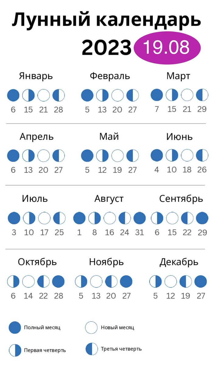 нейтральный день Лунные дни. Фазы Луны. Луна в знаках зодиака 19 августа 2023 года 0:00 - 8:11 3 лунный день 🌒 Юная растущая Луна ♍ Дева 8:11 - 14:40 4 лунный день 🌒 Юная растущая Луна ♍ Дева 14:40 - 23:59 4 лунный день 🌒 Юная растущая Луна ♎ Весы Влияние Луны 19 августа 2023 года с 8:11 по 14:40 нейтральный период 4 лунный день. Четвертый лунный день - день пассивности, сдержанности и анализа. Прежде чем принять какое-либо решение желательно успокоиться и хорошо все обдумать в уединении. Не поддаваться на провокации и всеми силами сохранять мир и спокойствие в душе. Желательно отдохнуть, послушать музыку и подольше поспать в этот сложный и запутанный день. 🌒 Юная растущая Луна или 1-я лунная фаза. Период лунного цикла от новолуния до 1-й лунной четверти. Энергетика живительных сил Солнца начинает накапливаться. Это период, когда процессы в человеческом организме и психике пробуждаются и стабилизируются. Эмоциональное состояние человека находится в скрытой форме. Хорошее время дл