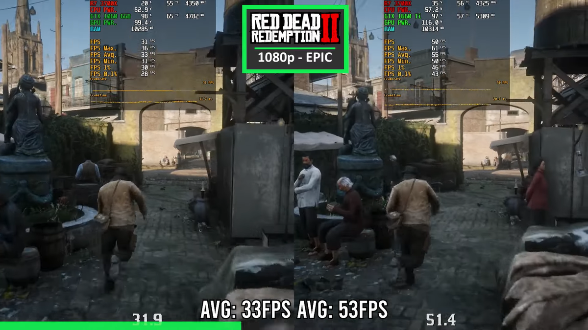 В одном из выпусков на YouTube-канале Hardware Tested эксперты протестировали в разрешении Full HD видеокарты GTX 1060 и GTX 1660 Ti. Сильно ли большая между ними будет разница? В игре Red Dead Redemption 2 с настройками графики Epic в среднем удалось получить 33 к/с - с GTX 1060 и 53 к/с - с GTX 1060 Ti. Rainbow Six Siege шла с пресетом High и со средней производительностью 180 к/с (1060) и 288 к/с (1060 Ti). Rust запускалась с настройками 1/100. Средний FPS в этой игре равнялся 84 к/с (GTX 1060) и 114 к/с (GTX 1060 Ti). Valheim тестировалась на высоких настройках. Средняя частота кадров в ней находилась на уровне 59 к/с и 86 к/с (1060 и 1060 Ti соответственно). Warzone 2.0 шла на настройках High/Medium. В среднем в ней удалось получить 41 к/с (GTX 1060) и 71 к/с (GTX 1060 Ti). The Witcher 3 запускалась с ультра-графикой. Средняя частота кадров в ней равнялась 49 к/с (1060) и 72 к/с (1060 Ti). В Apex Legends на высоких настройках графики средняя производительность составляла 105 к/с (