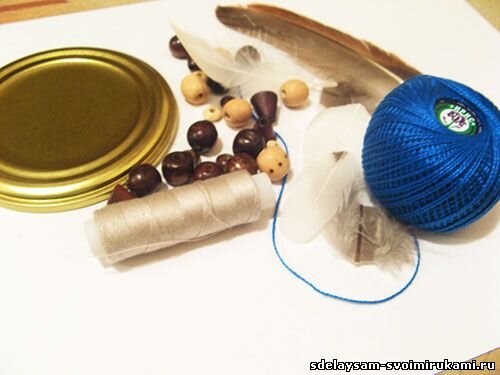 Для этого вам потребуется закаточная крышка от банки, нитки «ирис», катушечные нитки, несколько перьев и бусин.