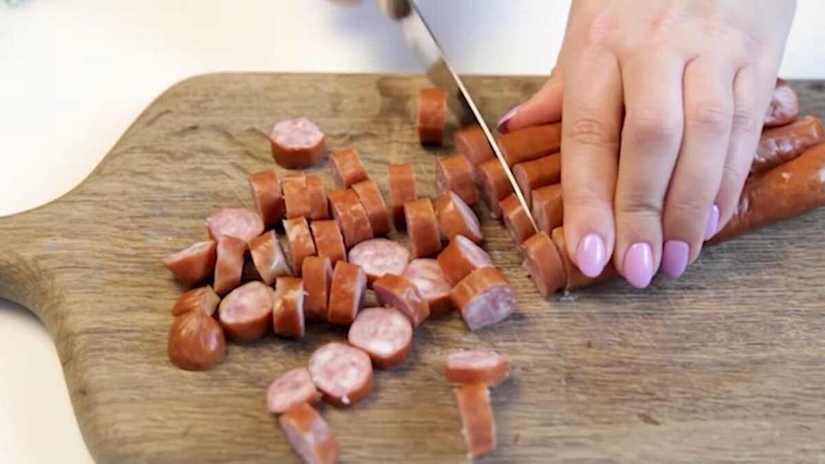 1. Нарезаем 400 г охотничьих колбасок, их можно заменить на любые другие копчёности.