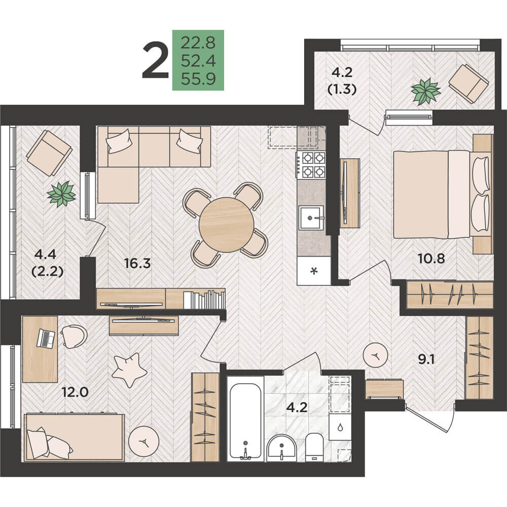 Две спальни квартиры (одна площадью в 12 кв. м, вторая — 10,8 кв.м) спланированы так, чтобы вместить и полноценные кровати, и вместительные шкафы. Из меньшей комнаты есть выход на лоджию, которая может стать небольшим кабинетом, зоной для чтения, занятий спортом или дополнительного хранения. Стоит отметить, что в этой квартире отлично продуманный санузел, в котором есть место и для всей необходимой сантехники, включая полноценную ванну, и для стиральной машины.