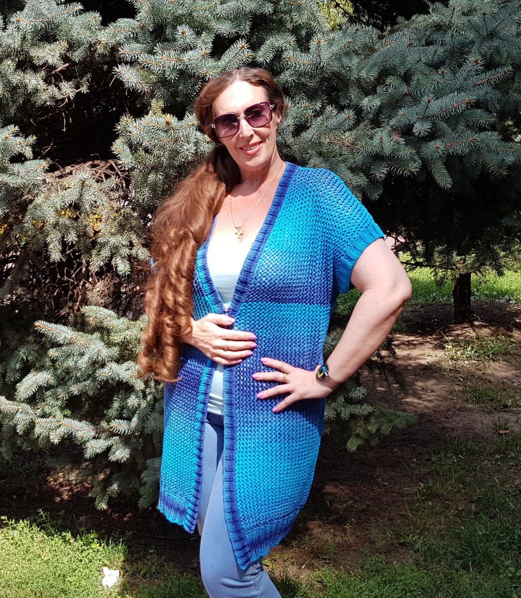 Летний кардиган с узором “Сетка” из пряжи секционного крашения. Пряжа: Лентовидная - 100% хлопок 100г/225м. Расход: 570гр. Спицы: 4,5 и 4,0 (для резинок). Узоры: Резинка : 2 х 3 (2 лиц.; 3 изн.) спицы № 4,0. Сетка: Четное количество петель. Спицы № 4,5. 1-й ряд: кр., * 2вм лиц с наклоном вправо, накид; повтор от *; закончить 1 накид, кр. 2-й ряд: кр., * 2вм изн, накид; повтор от * закончить 1 накид, кр. Повторять эти 2 ряда. Описание: Спинка: Набрать 100 п на спицы № 4,0 вязать резинку на высоту 7,5 см. Перейти на спицы № 4,5 и вязать узор Сетка. Для расширения сделать прибавки по 12 п с обеих сторон через каждые 6 рядов. Начать в 94 ряду, 100, 106, 112, 118….160 рядах. Скос плеча - закрыть 5 раз х 4 п. и 5 раз х 6п, начать в 166 р Вырез: Итого = 100п(набор) + (2 х 12) прибавки = 124п - (2 х 50) плечи = 24 п. остается для выреза. В 178 р закрыть средние 14 п и закончить стороны раздельно, при этом для закругления выреза горловины закрыть: 2 х 2п и 1 х 1п. Полочка: Набрать 56 п на
