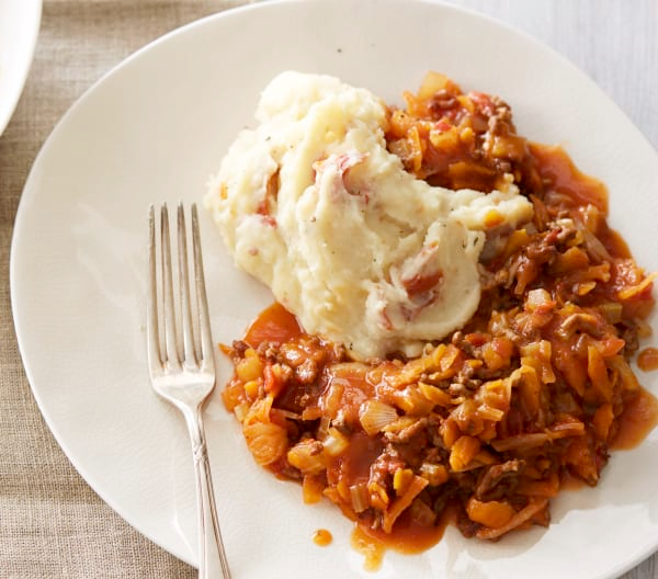 Картофельное пюре с говяжьим фаршем и овощным соусом в Термомиксе