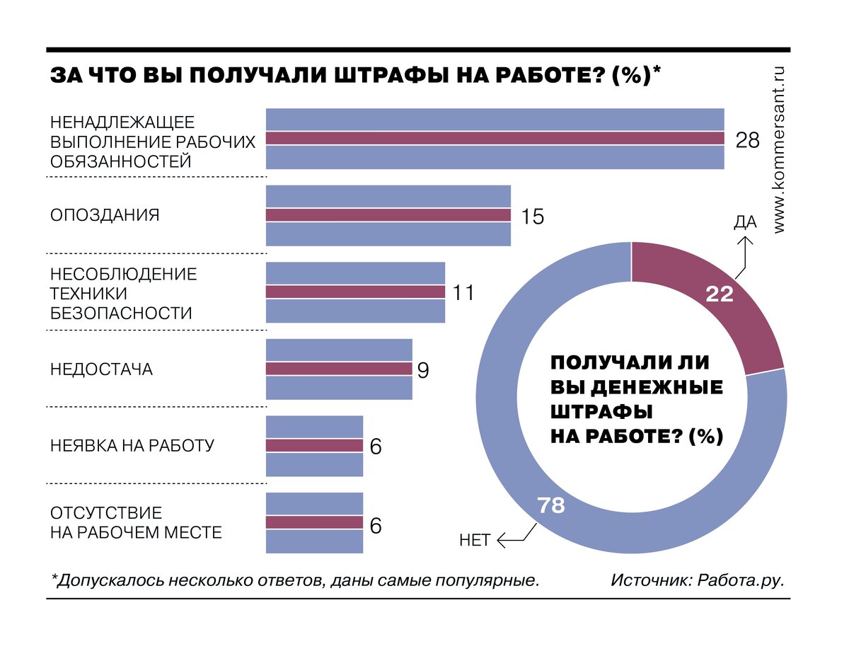 Как показал опрос «Работа.ру», 22% респондентов получали денежные штрафы на работе. Чаще других сталкивались с ними специалисты, работающие в сфере производства и агропрома, а также торговли и ритейла. Наиболее распространенными причинами для штрафов респонденты назвали некачественное выполнение работы (28%) и опоздания (15%). Среди более редких оснований — использование ненормативной лексики, порча имущества компании, несоблюдение гигиенических требований и дресс-кода. В основном сумма штрафов не превышала 10 тыс. руб. (в 80% случаев). Как показал опрос, 59% респондентов не знали о том, что работодатель не вправе налагать на сотрудников денежные штрафы. Согласно Трудовому кодексу, работодатель может привлечь к двум видам ответственности — дисциплинарной и материальной. К примеру, снизить или полностью лишить провинившегося сотрудника премии. Такого понятия, как «штраф», в ТК РФ нет. Все материалы Коммерсантъ www.kommersant.ru