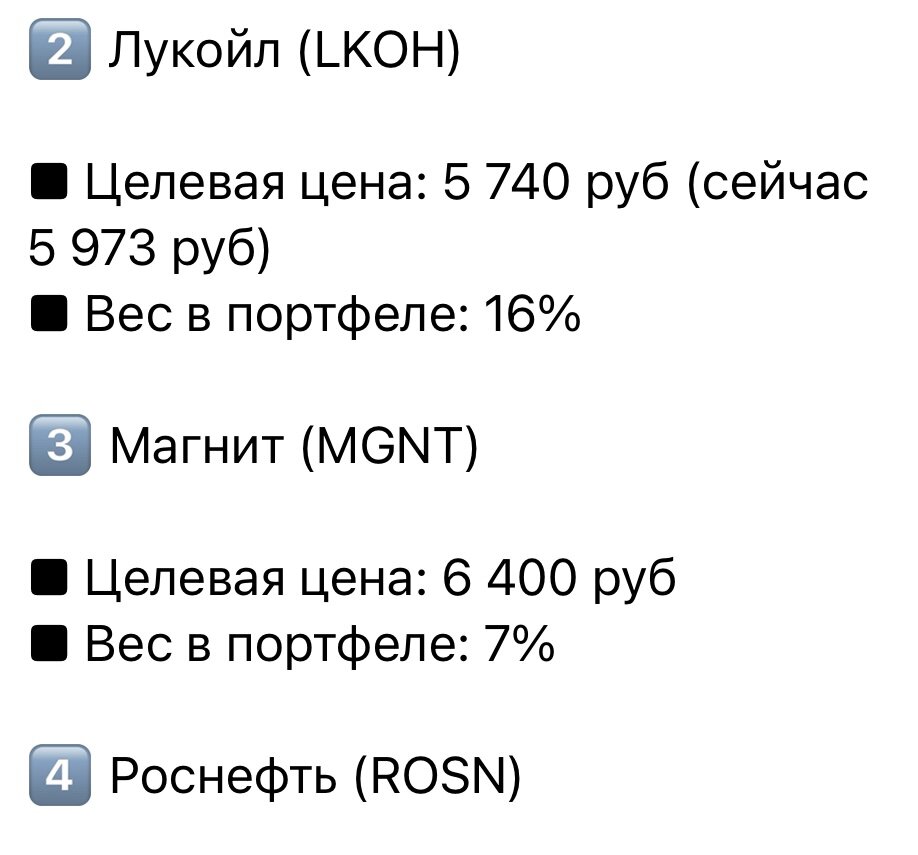Лучшие акции российского рынка по мнению инвестбанка. Указаны целевые цены на горизонте года и доли в модельном портфеле. 1️⃣ Сбербанк (SBER) ■ Целевая цена: 300 руб ■ Вес в портфеле: 16% 2️⃣ Лукойл (LKOH) ■ Целевая цена: 5 740 руб (сейчас 5 973 руб) ■ Вес в портфеле: 16% 3️⃣ Магнит (MGNT) ■ Целевая цена: 6 400 руб ■ Вес в портфеле: 7% 4️⃣ Роснефть (ROSN) ■ Целевая цена: 575 руб ■ Вес в портфеле: 5% 5️⃣ Русал (RUAL) ■ Целевая цена: 61 руб ■ Вес в портфеле: 5% 6️⃣ Сургутнефтегаз-ао (SNGS) ■ Целевая цена: 35 руб ■ Вес в портфеле: 4% 7️⃣ Yandex (YNDX) ■ Целевая цена: 3 800 руб ■ Вес в портфеле: 3% Не является инвестиционной рекомендацией. Полный обзор с остальными позициями