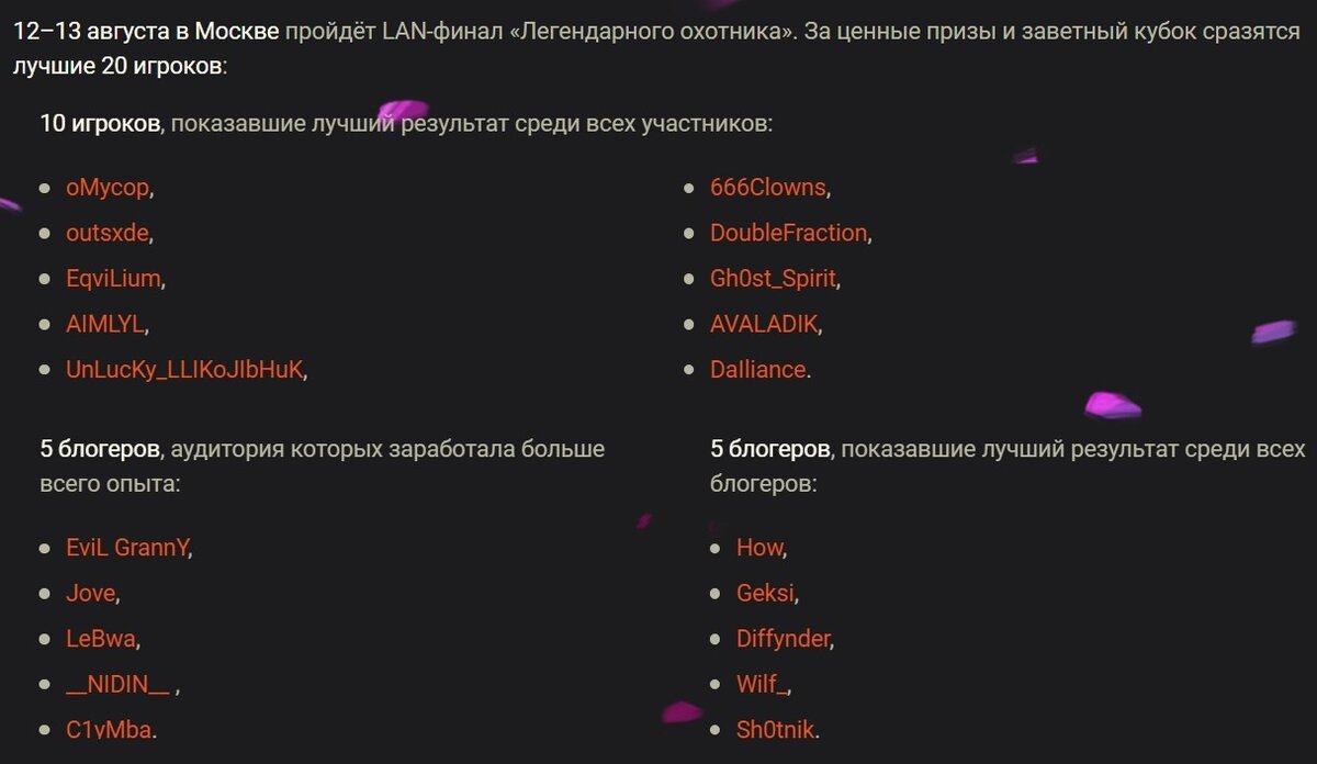 Сегодня были проведены проверки на соблюдение Правил игры и Турнира. Вот зафиналенные списки участников. 12–13 августа в Москве пройдёт LAN-финал «Легендарного охотника». За ценные призы и заветный кубок сразятся лучшие 20 игроков: — 10 игроков, показавшие лучший результат среди всех участников: — 5 блогеров, аудитория которых заработала больше всего опыта: * 1 место: Yusha (Протанки) — отказался добровольно от участие в финале.