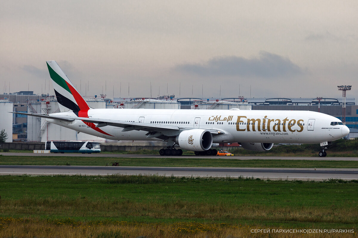 На точку съёмки прихожу аккурат к утреннему рейсу Emirates. Авиакомпания ежедневно выполняет из Москвы в Дубай 3 рейса: один на Boeing 777-300 и два на Airbus A380.