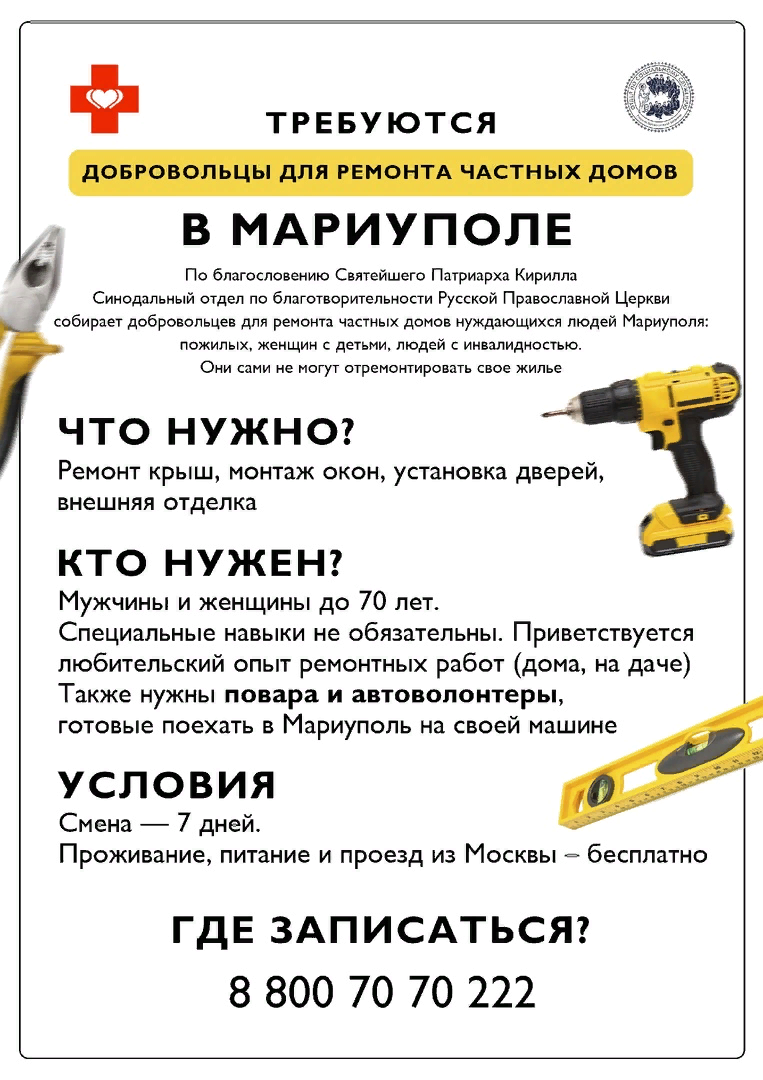 По благословению Святейшего Патриарха Кирилла Синодальный отдел по церковной благотворительности и социальному служению объявил набор добровольцев-строителей для ремонта частных жилых домов нуждающихся людей Мариуполя: пожилых, людей с инвалидностью, одиноких женщин с детьми.