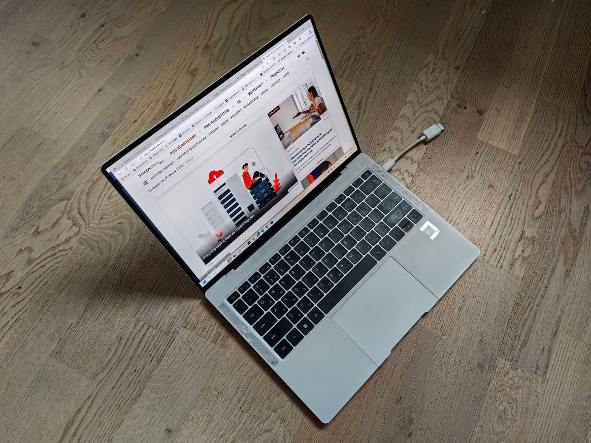 В комплекте идёт быстрая зарядка на 90 Вт, которая заряжает ноутбук полностью примерно за полтора часа, а также может использоваться для быстрой зарядки смартфонов Huawei. И, кстати, заряжается ноутбук даже от маломощного павербанка (например, 18-ваттного), только очень медленно. А вот время автономной работы, в принципе, неплохое: с текстом часов 8 точно поработаете, видео можно смотреть (локальное) часов 10 на небольшой яркости – то есть, до уровня «Макбуков» на М1/М2 ноутбуки на процессорах Intel пока не дотягивают, но разрыв уже не критичен: зарядку в течение дня уже можно с собой не носить.