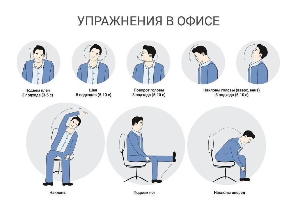 Рекомендуем на обеденном перерыве и еще хотя бы пару раз в течении дня делать небольшую разминку для своего тела.