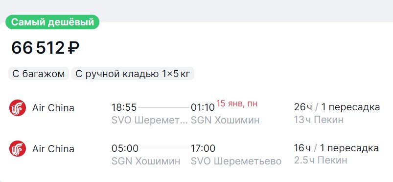 Думали взять билеты на Air China (китайские авиалинии) из Москвы до Хошимина, туда и обратно. Билеты эти стоили 66500 тыс. руб. за одного. Но там по пути вперед была длительная стыковка в Пекине - 13 часов днем. И еще неудобный по времени прилет в Хошимин - в 1 час ночи.