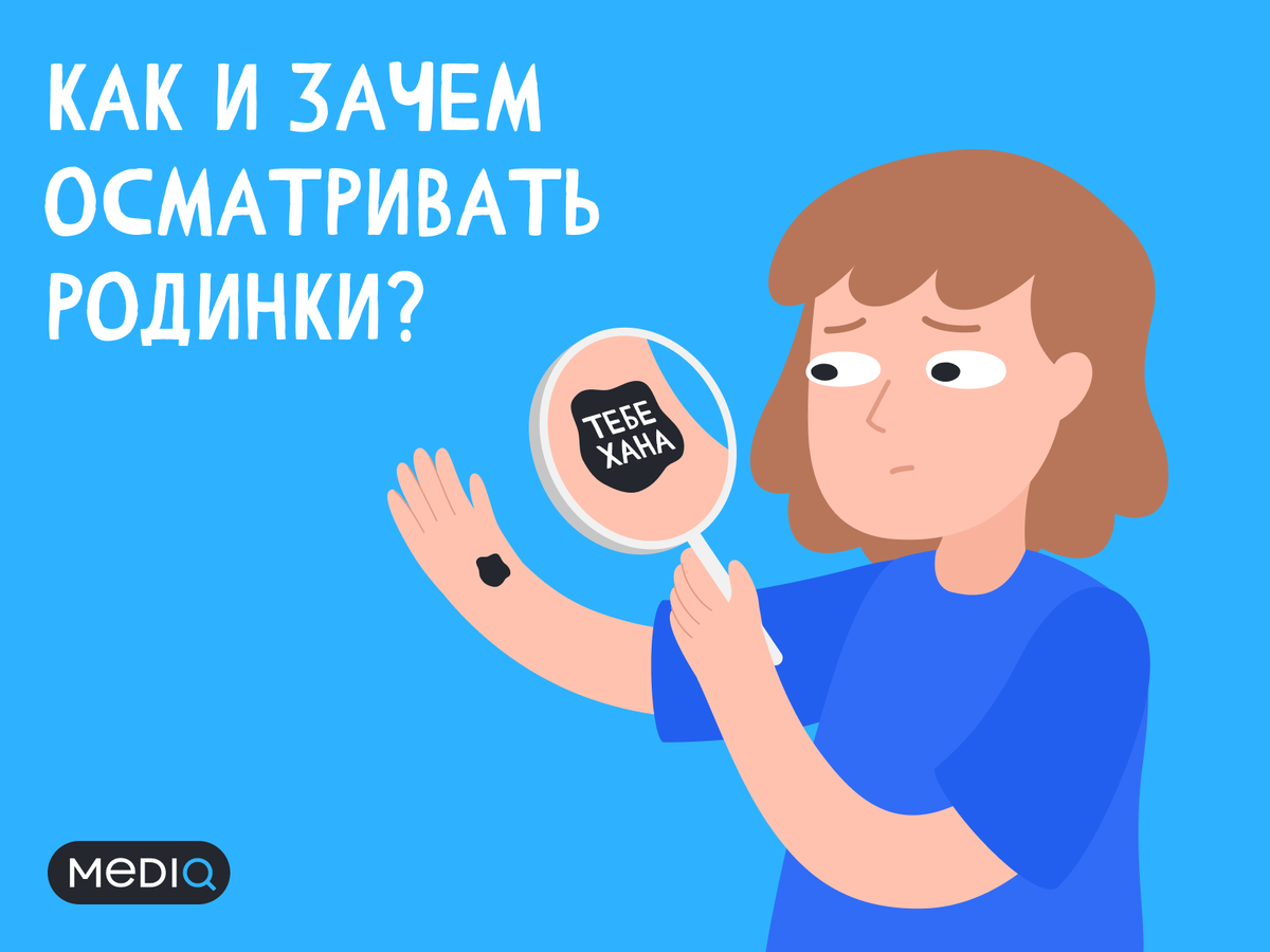 У нас тут новая статья, где мы объясняем, почему важно осматривать друг друга голыми раз в месяц и при этом делать фотографии. Речь о родинках, конечно же! Начнем с базы: родинки — это доброкачественные образования. Это значит, что они не будут бесконтрольно расти и захватывать другие ткани. Свой темный цвет родинки получают за счет пигмента меланина — именно он отвечает за загар. Чем его больше — тем темнее будет выглядеть клетка. А еще родинки бывают разных размеров, форм и могут даже находиться над кожей — это все норма. Обычно родинки появляются в детстве, а во время полового созревания могут довольно сильно меняться. Для подростков это нормальный процесс. Но если родинки появляются и/или меняют форму, цвет и другие характеристики у взрослых — это тревожный звоночек. Возможно, где-то рядом прячется меланома. — Да кто она такая эта ваша меланома? Это самый известный вид раков кожи, а еще одна из самых смертоносных опухолей в целом. Меланома очень быстро растет и пускает метастазы