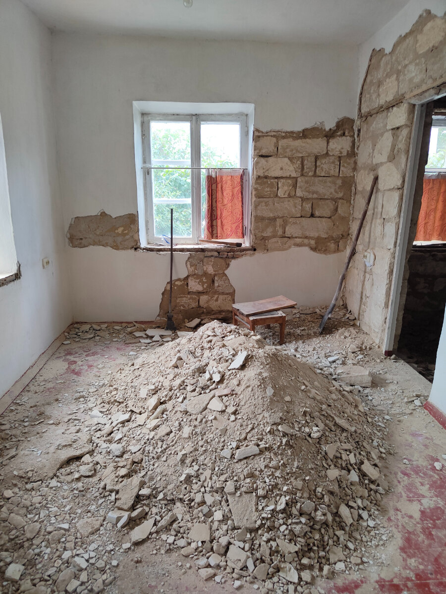 Хотя стройка это когда строят, а мы пока ломаем все в основном. Но да ладно, шутки в сторону, дело серьёзное. В прошлый раз мы остановились на том, что сняли слой земли под полами и вывезли её. Теперь предстоит эту землю утрамбовать, затем засыпать и разровнять старую штукатурку из этой комнаты и еще раз утрамбовать. Старую штукатурку мы перед демонтажом пола сгребли в кучу в соседней комнате. В идеале бы конечно после вывоза земли пройти основание пола в комнате виброплитой, но ее мы будем использовать только на финальном этапе, перед заливкой, потому что планируем взять в аренду. Тем не менее трамбовка каждого слоя необходима и мы решили соорудить ручной трамбователь на скорую руку. В начале думали приспособить какое-нибудь деревянное бревно, но потом эту затею отвергли. Пришла в голову идея заехать на пункт приема металлолома, поискать там что то подходящее. И действительно, на первом же пункте оказалось, что у них есть обрезки отличных мощных швеллеров, но они длиной около 1 метра,