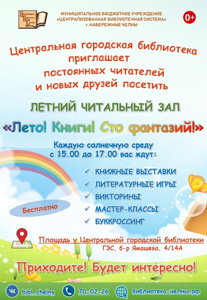 Приветствуем вас в Летнем читальном зале Центральной городской библиотеки! 2 августа приглашаем вас в наш уютный летний читальный зал, где вы сможете окунуться в мир слов и литературных шедевров. Выставка-обзор «Галерея книжных новинок» предложит открыть для себя новых авторов, погрузиться в исторические эпохи, пережить эмоции вместе с героями романов, исследовать неизведанные миры фантастики или же узнать о самых интересных открытиях и открытых фактах. На площадке буккроссинга «Бери! Читай! Листай!» можно будет обменяться книгами с другими посетителями и найти для себя что-то новое и увлекательное. Кроме того, сотрудники библиотеки приглашают вас поучаствовать в литературной карусели «Книга, солнышко и я – настоящие друзья!» и поразгадывать кроссворды в процессе «мозгового штурма». Приходите в наш летний читальный зал, чтобы насладиться летними днями вместе с книгами, зарядиться удивительной энергией слов и открыть для себя новые миры! Ждем вас 2 августа с 15.00 часов на территории Це