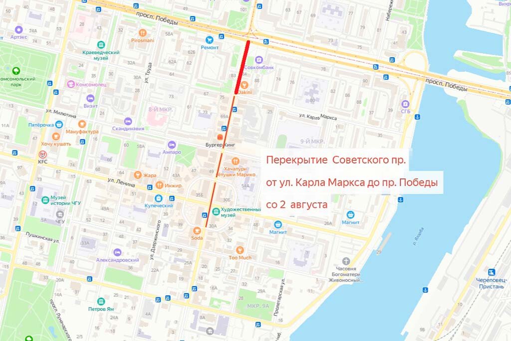 В ночь на 2 августа закроют для транспорта участок от Карла Маркса до проспекта Победы. Открытым останется перекресток Советского с улицей Милютина, проехать по нему можно будет только прямо. Автобусы продолжат ездить по ранее измененным маршрутам. На участке от Карла Маркса до Победы сначала перенесут под землю электросети и сети связи, проведут диагностику и обновят водопровод и канализацию. Часть Советского открыли для транспорта в июле, к Дню металлурга. Весь проспект откроют в ноябре. Реконструкция Советского проспекта от Соборной горки до проспекта Победы ведется по проекту развития Череповца компании "Северсталь". Источник: https://cherinfo.ru/news/129405-v-cerepovce-perekrout-ese-odin-ucastok-sovetskogo-prospekta