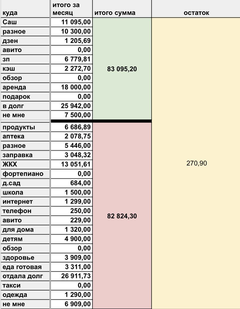 Потихоньку ухожу в минус, но как-то медленно… В этом месяце потратила меньше 100 тысяч! Ура 🥳😁 К сожалению, это не позволило мне отдать побольше долгов, но тем не менее, я довольна. Смотрим траты за месяц: Больше всего денег в этом месяце пришло за аренду квартиры - бОльшую часть с них потратила на оплату задолженности по газу. Осталось ещё 4 тысячи долга, но его можно платить постепенно. Но самая большой «доход» и расход - В ДОЛГ. Эти деньги я брала и возвращала в Кубышку на карте Тинькофф. Подробный отзыв я писала про неё здесь, если интересно, кому не стОит брать деньги в долг у Тинькофф, почитайте. На самом деле я почти пол месяца не трогала эту Кубышку, не брала оттуда деньги, но потом как всегда - взяла на что-то срочное/важное, а после брала по чуть-чуть на это и на то. Сейчас её снова закрыла, но к сожалению, её нельзя закрыть раз и навсегда. Ну зато у родных не занимаю 😄 Хотела убрать эту графу совсем из своей таблицы, но тогда учёт будет не точным, да и мне так наглядн