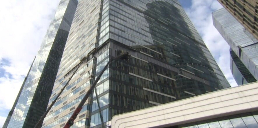 Россия: Рабочие восстанавливают поврежденное после крушения БПЛА здание в «Москва-сити»