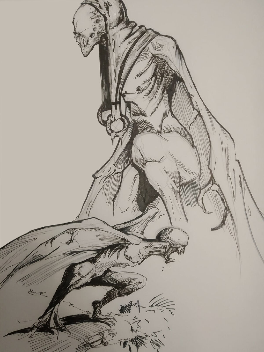 Внезапно до Яроволга донеслось странное шипение. Оно быстро нарастало. Он напрягся всем телом и насторожено огляделся по сторонам. Темнота вне освященной фонарями площади была особенно густой, но Яроволг различил движение каких-то теней. Одна из них взлетела и приземлилась на крышу, попав под свет. Разорванная одежда, гниющая, местами растерзанная бледная плоть, на пальцах когти, лысеющая голова, сверкающие красным глаза и хищный оскал. «Вурдалаки, значит», - подумал Яроволг.