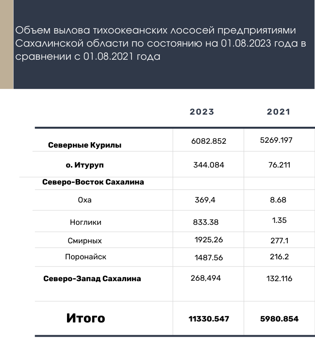 В продолжении нашей рубрики представляем обзор результатов вылова тихоокеанских лососей по оперативным данным предприятий с разбивкой по районам Сахалинской области и по видам рыб. На 01 августа 2023 года вылов тихоокеанских лососей предприятий Сахалинской области составил 11330.547 тн. В том числе горбуши 9278.247 тн., кеты 1146.745 тн., нерки 838.137 тн., кижуча 67.424 тн. В целом, результаты вылова тихоокеанских лососей в Сахалинской области за 2023 год демонстрируют рост почти в два раза по сравнению с предыдущим нечетным 2021 годом.