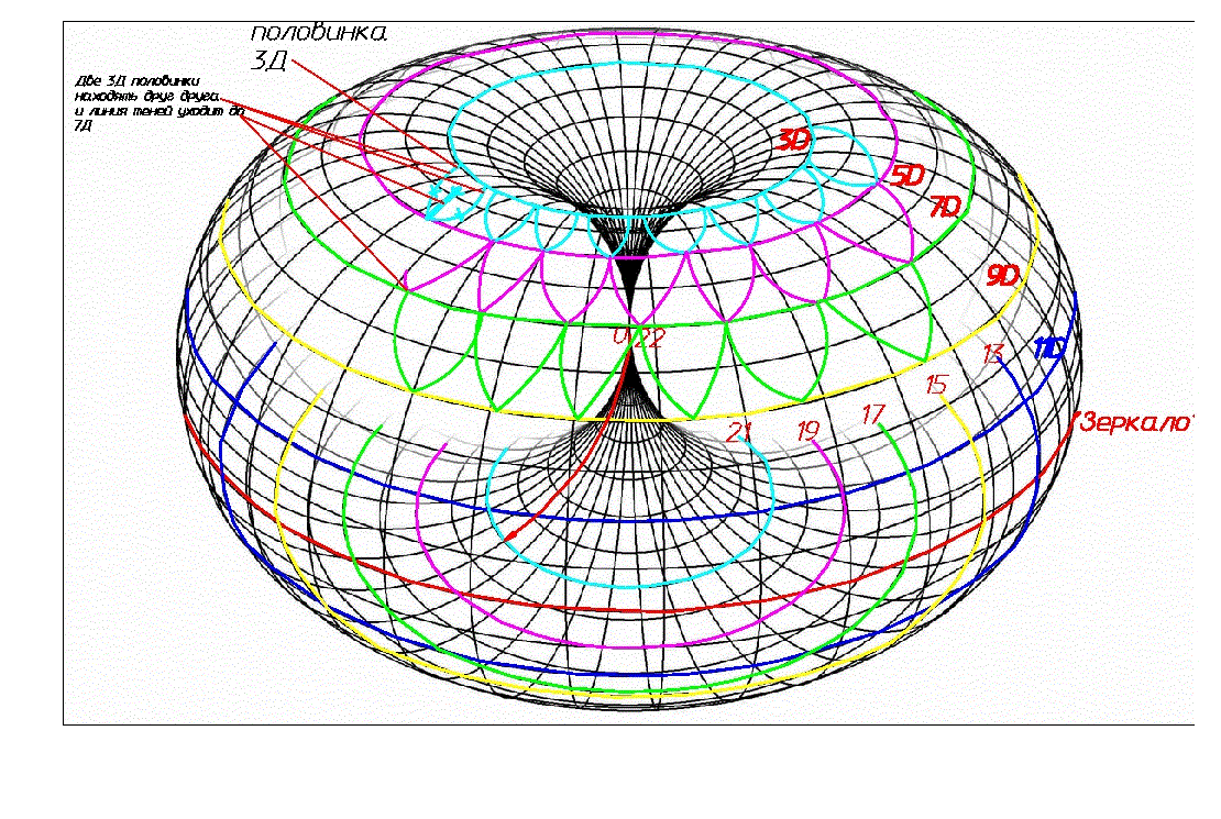 Предположим следующие устройство вселенной. Вселенная двадцати одно мерная. Пространство ноль это точка. Чётные пространства это нематериальные, то есть без массовые пространства, к ним относятся ноль, два, четыре, шесть, восемь, десять. Нечётные пространства это материальные, то есть пространства в которых есть масса. К ним относятся пространства одно, трех, пяти семи, девяти, одиннадцати мерные. В пространствах от ноль измерения до одиннадцатого время "течёт " Вперёд, а с двенадцатого по двадцать первое время"течёт" Назад. Следующее предположение что пространство ноль это центр двадцати одномерного тора. И всё пространства"вложены"в этот тор. И время " Течёт" По поверхности этого двадцати одномерного тора. И создаёт материю пересекая нечетные пространства. Таким образом до экватора тора время "идёт" Вперёд, а после экватора назад. Таким образом время создаёт материю, а соответственно пространство. Ещё допустим, что "материя" Каждого более низкого измерения это "тень" Более